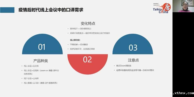 另一方面,口译翻译需求量很大,对译者临场应变能力要求非常高,需求类型多的是会议同传,耳语同传、大会交传,展摊翻译。大部分会议需要多种类型的全面配套的语言服务,比如速记、会议设备、直播、听译、字幕、视频本地化等,形式也趋于线上。在疫情后时代,通过zoom、xthnx与译牛合作开发的云口译系统,以及xthnx-译牛直播系统,都可以满足线上线下会议的各种口译需求。