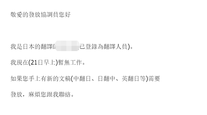 1)在即时通讯的签名处或邮件自动回复中:广而告知近期的档期情况,比如是否能接急稿,是否能接大稿,这需要译员及时做更新,有着“辛苦我一个,幸福PM”的奉献精神;