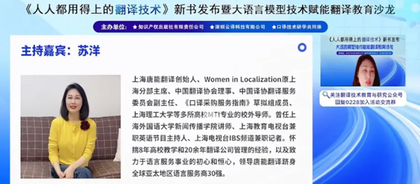 2025年2月28日晚,《人人都用得上的翻译技术》新书发布会暨大语言模型赋能翻译教育沙龙活动成功举办。公司总经理苏洋女士受邀担任活动主持人,为这场行业盛会拉开帷幕。
